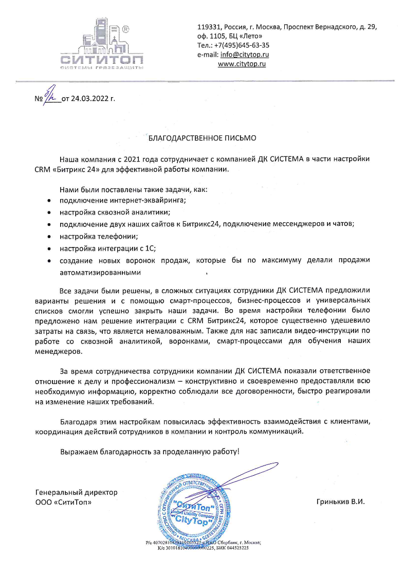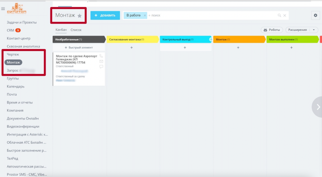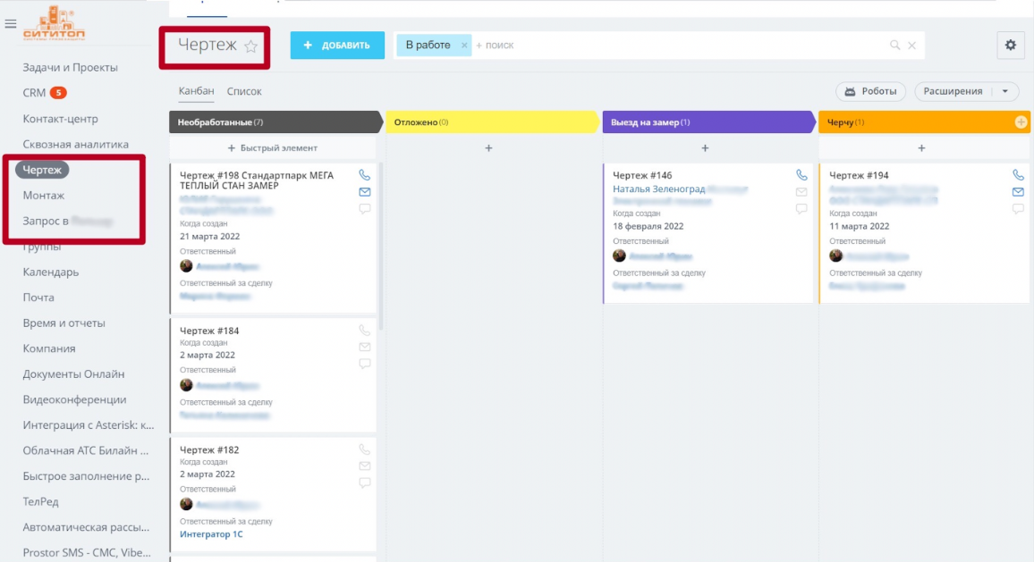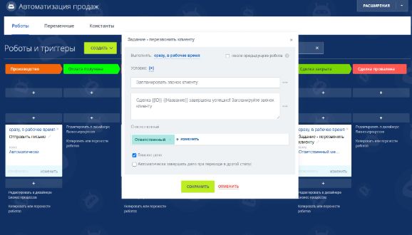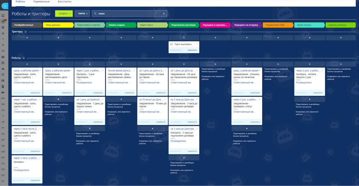 Настроена система автоматических уведомлений (роботы) ответственному за сделку и руководителю для контроля за сроками и планирования работы со сделкой. Также настроены роботы для взаимодействия с клиентом (звонок клиенту после отправки документов, контроль времени ожидания карточки в стадии, создание задания по планированию касания с клиентом, отправка письма клиенту, когда заказ поступил на производство).
