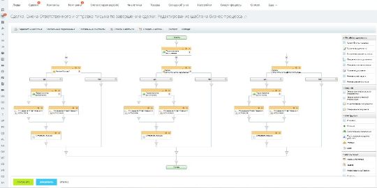 На стадии Сделка закрыта настроен робот, который запускает выполнение созданного нами бизнес-процесса. Этот бизнес-процесс который меняет Ответственного Контакта и Компании по сделке на Ответственного из отдела, который занимается продажей повторным клиентам (Отдел Клиентского Сервиса), в зависимости от региона клиента и отправляет клиенту об этом письмо.